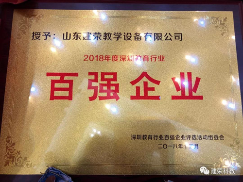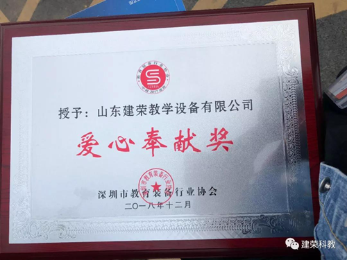 山東建榮教學設備有限公司被深圳教育裝備行業協會授予深圳教育裝備行業協會愛心奉獻企業和深圳教育裝備行業百強企業榮譽稱號。