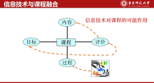 概括的來說可以用這個圖,該能力由課程所涉內容,培養教學的目標、教學的過程以及教學的評價組成。在信息技術整合與學科教學推進的過程當中,我們還必須要利用信息技術支持內容的準備,去支持在我們現在的環境當中去開展教學的過程,以及對學生的進行過程性以及結構性的評價。