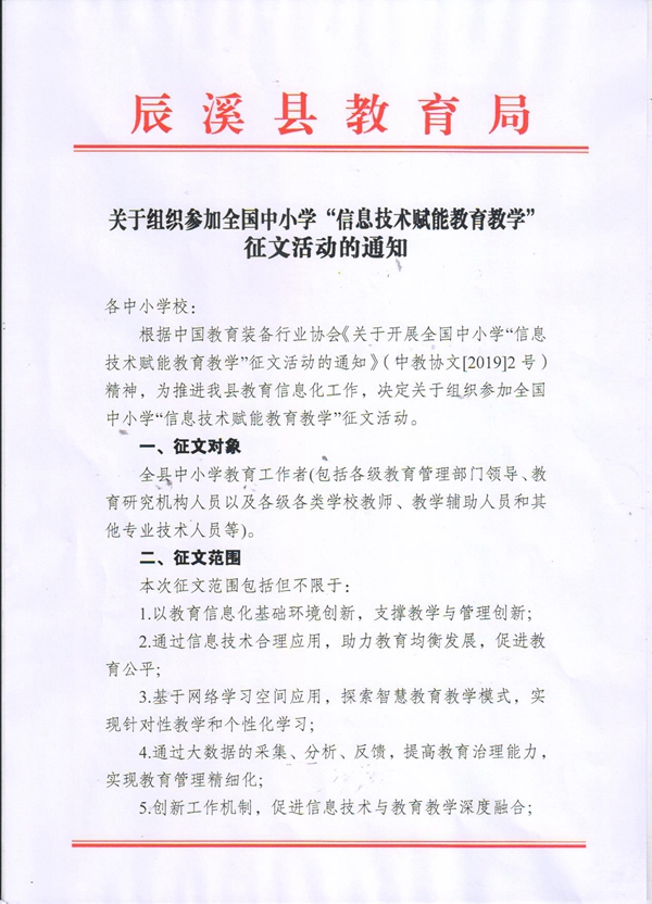 辰溪縣電教儀器站關于組織參加全國中小學“信息技術賦能教育教學”征文活動的通知