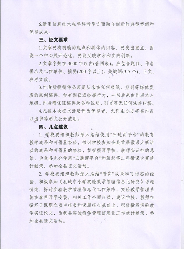 3. 學校要組織教師發揮想象力和創造力,以實證研究為主線,積極撰寫“信息技術賦能教育教學”論文,為信息技術賦能教育教學獻計獻策,參加全縣征文活動。