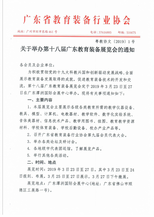 為積極貫徹黨的十九大科教興國和創新驅動發展戰略,全面展示教育裝備發展取得的成就,促進教育裝備技術的開發和交流,第十八屆廣東教育裝備展覽會定于2019年3月23日至27日在廣東潭洲國際會展中心舉辦,現將有關事項通知如下: