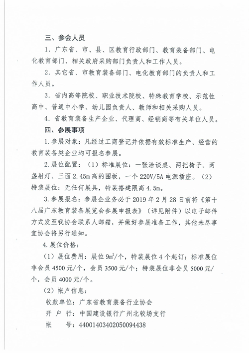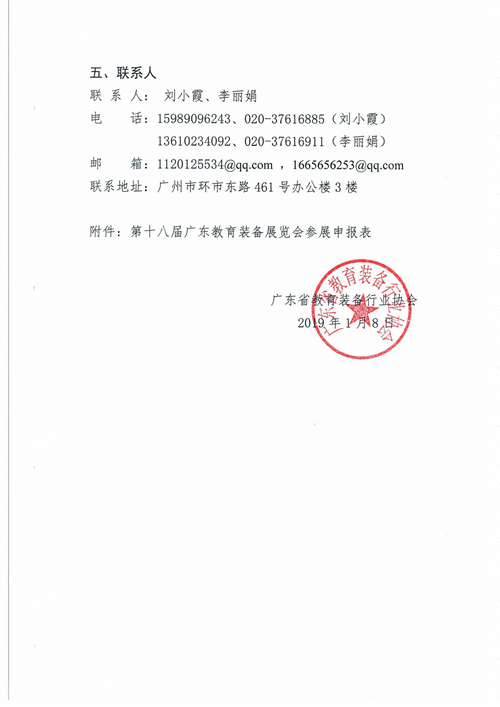 3.參展報名:參展企業務必于2019年2月28日前將《第十八屆廣東教育裝備展覽會參展申報表》(詳見附件)以電子郵件方式發至我協會聯系人郵箱,并做好參展準備工作,其他未盡事宜協會將另行通知。