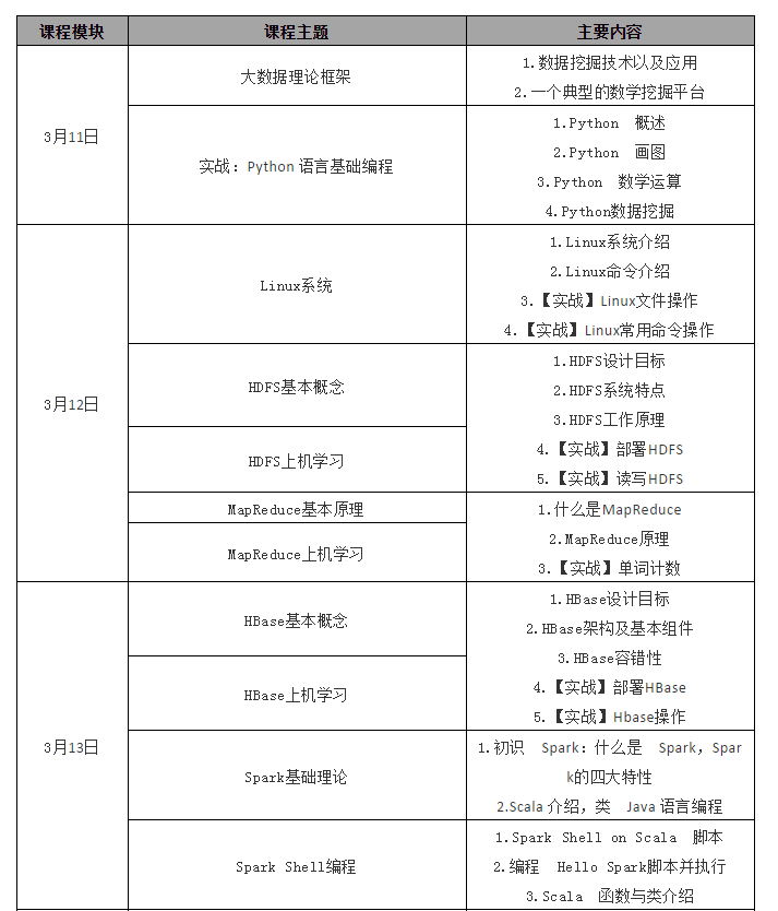 課堂沒有冗長乏味的理論講授,而是通過密集的高強度實戰課程,帶領學員克服大數據能力提升中各階段的典型痛點和難點:幫助每位參訓學員跑通每一項實驗,讓學員能學到真本事;幫助院校教師開拓課程開設思路;幫助學生解決畢業就業面臨的實戰能力問題;幫助科研人員打磨科研方向等。您不需基礎,就可以直接動手實驗,更重要的是,通過參加本次培訓,再加以自學,可實現學員在理論和實踐、培訓和自學之間的輕松轉換。具體培訓大綱如下: