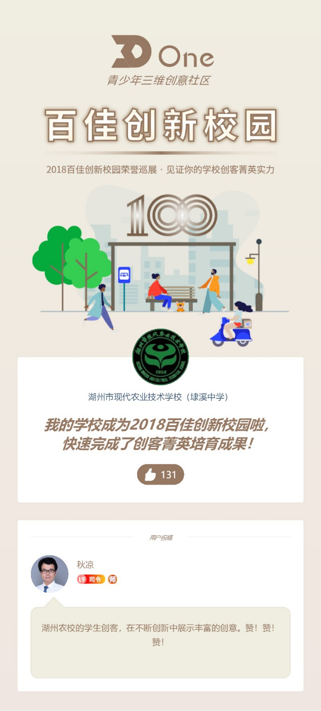 本次評選重點考核每個學校培養出“校園創客”(注1)的質量和實力,這100所入選學校在2018年共培育出將近2000個校園創客,設計了超過1.1萬個優秀的3D創意作品(注2),各具不同的教學特色和風格。為了方便更多學校可以交流學習,i3DOne社區啟動了“百佳創新校園的榮譽巡展”,本校師生可以獲取專屬的榮譽海報,展現本校實力并收獲更多點贊認可,強化學生對3D創意設計學習成果的認同和集體榮譽感。