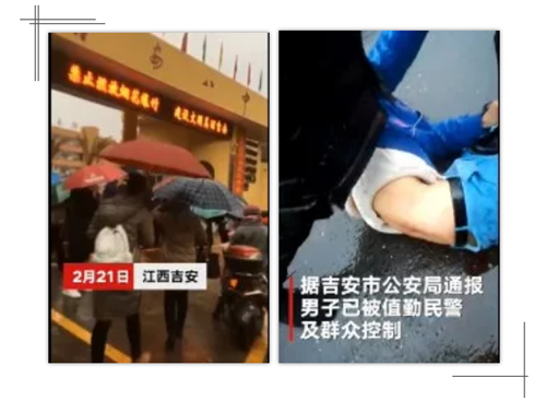 2019年2月21日上午,江西吉安八中門口一男子持刀刺傷多名學生,被群眾當場制服。從吉安教育局獲悉事發地點在吉安八中校外。另據吉安警方透露,男子已被值勤民警及群眾控制。共11人受傷,包括輔警、學生,已送醫救治,暫無生命危險。
