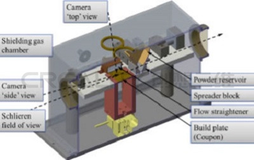 開放式架構PBF系統的示意圖,其中包括對高速成像和紋影成像的修改。科學家們使用開放式結構PBF系統進行現場測量,提供完全密集組件的自動構建。電腦提供了構建板在層之間的垂直移動、硅繩粉末涂布機的運動、激光照射和掃描和靈活性可用于激光功率和速度。