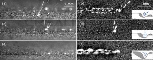 使用激光功率掃描單個軌道(從左到右掃描方向)時的側視圖和俯視圖的高速圖像,掃描速度為(a)和(b)50 W和0.1 m / s; (c)和(d)100W和0.5m / s以及(e)和(f)200W和1m / s。插圖是熔池形狀的示意圖,其決定了激光羽流方向。所有數字的視頻都包含在補充材料中。