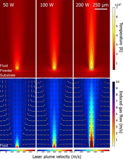 (上)計算50,100和200 W激光功率的溫度場。 (底部)快速激光羽流的計算速度表面圖,箭頭表示它引起的較慢的大氣氣流。