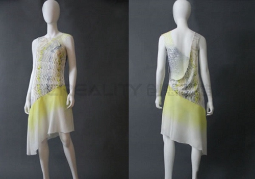 第二個是 Sun為這項研究所采取的路線,其重點是“視覺幻覺的靈感”。太陽融合了有機形式,融合在一起看起來像蕾絲,在原型服裝中,具有精致的軀干和裙子部分,這款喇叭形真絲半身裙采用不對稱下擺設(shè)計。這件連衣裙的軀干部分融合了兩個數(shù)字設(shè)計應(yīng)用,內(nèi)襯絲綢電力紡,作為最基本的平紋真絲織物之一,并且不需要拉鏈形式的額外封口。