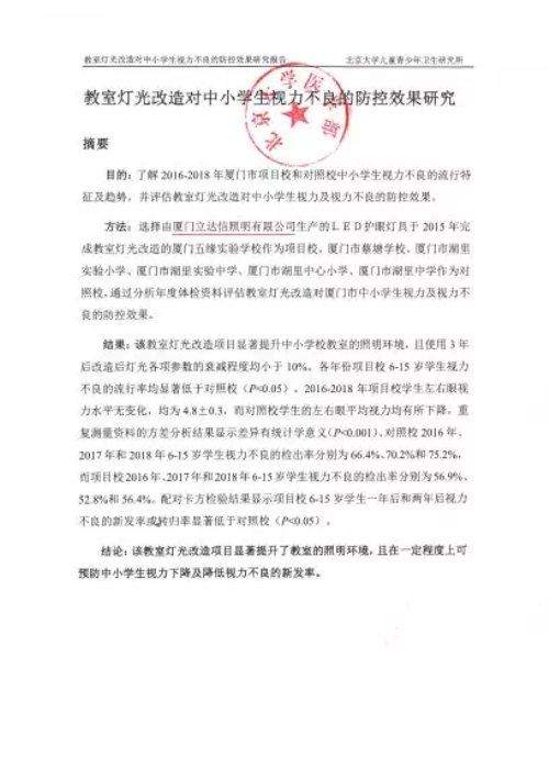 由北京大學(xué)醫(yī)學(xué)部、北京大學(xué)兒童青少年衛(wèi)生研究所出具的評估報告《教室燈光改造對中小學(xué)生近視不良的防控效果》顯示:立達(dá)信改造項目顯著提升了教室的照明環(huán)境,在一定程度上可預(yù)防中小學(xué)生視力下降及降低視力不良的新發(fā)率。