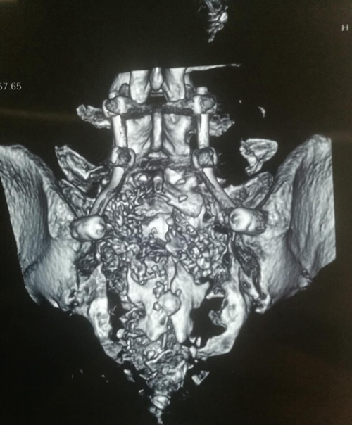 據(jù)了解,骶神經(jīng)調(diào)節(jié)手術(shù)主要治療骶三神經(jīng)損傷造成的排尿排便功能障礙,一般通過骶三神經(jīng)孔將電極放置進(jìn)去。但是,這位患者因?yàn)轺竟欠鬯樾怨钦郏茐牧索救窠?jīng)孔,無法定位骶三神經(jīng),為治療帶來了極大困難。