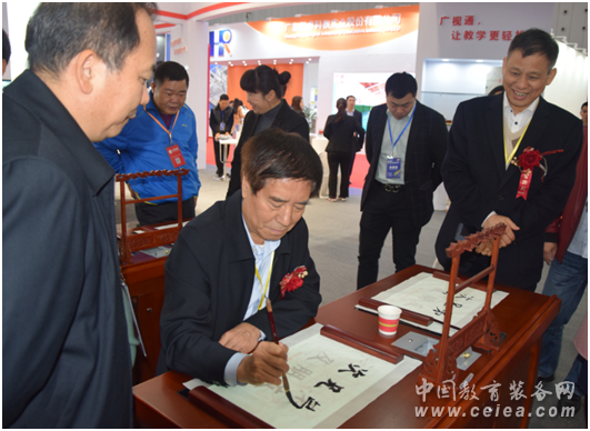 中國教育裝備行業協會會長王富在廣東廣視通科教設備有限公司展臺體驗書法教室產品