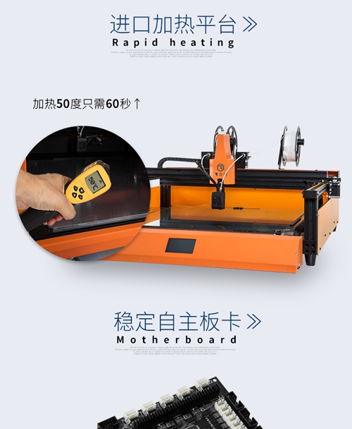 值得一提的是,T5發(fā)光字3D打印機針對發(fā)光字做了獨特的技術(shù)升級,熱床玻璃為特殊工藝玻璃完全不用擔(dān)心平臺不平問題,僅需90秒即可加熱至50度,打印大字不翹邊。并采用擠出為兩進一出的設(shè)計,有效的解決了雙噴頭左右上下不匹配的問題,特有的泰坦擠出平使用大扭矩電機,保持?jǐn)D出料的穩(wěn)定性。該設(shè)備還配置了全彩觸屏、近程送料、斷電續(xù)打等特色功能,使得整臺設(shè)備具有操作便捷、打印速度快、打印效果好等諸多優(yōu)點。