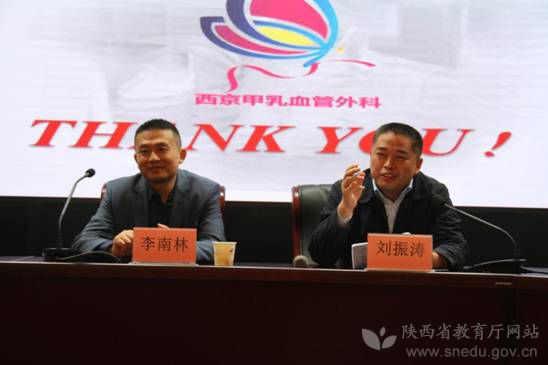 空軍軍醫(yī)大學(xué)西京醫(yī)院甲狀腺乳腺血管外科主任醫(yī)師李南林教授(左)在省委教育工委省教育廳作專題講座