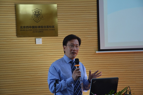 圖為2018年9月份北京四中馬景林校長在北京四中國際課程佳蓮校區(qū)開學典禮上講話