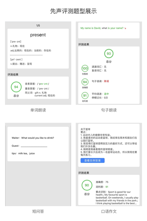 先聲智能語音測評系統(tǒng)在滿足對話和測評的基礎(chǔ)上,做到了全題型覆蓋、多維度反饋、實(shí)時(shí)測評、測評精確至音素級別,并滿足老師、學(xué)生、家長全終端無障礙使用。