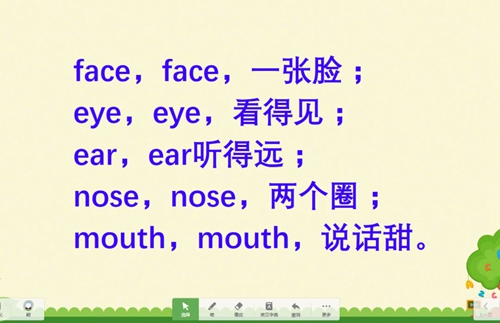小孩子天性活潑,喜歡有韻律、有節(jié)奏的 chant(頌歌)。PEP 教材三年級(jí)英語(yǔ)課本中,每單元都有對(duì)應(yīng)的 chant。我利用從網(wǎng)上下載的配套動(dòng)畫(huà),帶領(lǐng)孩子們一邊吟誦 chant,一邊拍手打節(jié)奏,孩子們不知不覺(jué)就將本單元所學(xué)知識(shí)串聯(lián)并背誦下來(lái)了。例如,在學(xué)習(xí)三年級(jí)上冊(cè)第三單元時(shí),我自創(chuàng)的 chant“face,face, 一 張臉;eye,eye, 看 得 見(jiàn);ear,ear, 聽(tīng) 得 遠(yuǎn);nose,nose, 兩 個(gè) 圈;mouth,mouth,說(shuō)話甜。”深受學(xué)生喜愛(ài)。學(xué)生在吟誦過(guò)程中,自己就配上動(dòng)作,指著對(duì)應(yīng)的身體部位,既讀熟了單詞,又利用情景學(xué)習(xí)法加深了對(duì)單詞的記憶。這節(jié)課獲得了沙河鄉(xiāng)優(yōu)質(zhì)課競(jìng)賽評(píng)委們的一致好評(píng)。