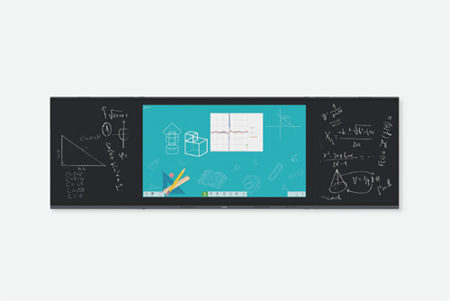智慧黑板:集交互智能平板與黑板于一體,中間的主屏同時(shí)承擔(dān)著顯示與書(shū)寫(xiě)功能,兩邊的黑板滿(mǎn)足傳統(tǒng)板書(shū)的需要。
