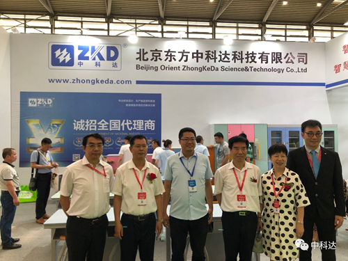 ▲中國(guó)教育裝備行業(yè)協(xié)會(huì)會(huì)長(zhǎng)王富與中科達(dá)副總經(jīng)理趙建敏及參展人員合影