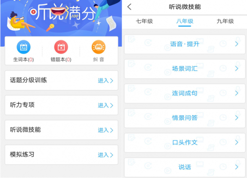 天學網英語聽說滿分(包括初中版和高中版),采用人機對話模式,即時反饋,讓你自信開口說英語。從發(fā)音糾正、情景對話、口頭作文、連詞成句等方面進行針對性微技能訓練,全面提升大家的英語聽說能力。
