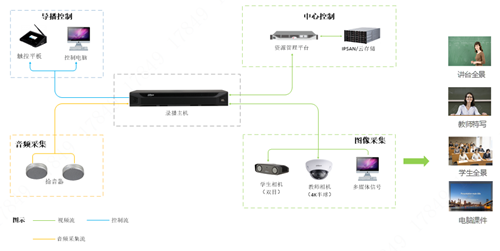 大華常態(tài)化4K教學(xué)錄播系統(tǒng)建設(shè)分為錄播教室和資源管理中心,錄播教室是硬件主要包含:1個(gè)4K教師攝像機(jī)、1個(gè)雙目學(xué)生攝像機(jī)、1臺(tái)錄播主機(jī)、1臺(tái)觸摸控制屏或者導(dǎo)播客戶端、2個(gè)拾音器。采集老師全景、老師特寫、學(xué)生畫面、電腦VGA畫面、HDMI畫面,通過自動(dòng)切換、跟蹤,實(shí)現(xiàn)課堂視頻的自動(dòng)合成。