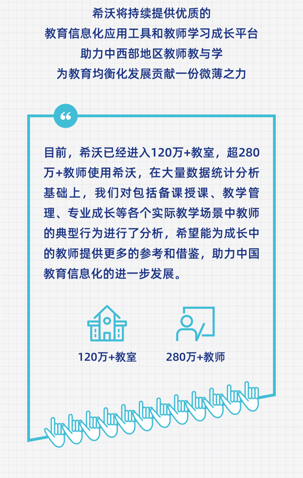 恰逢希沃十周年之際,希沃教育研究院聯合教育均衡化發展聯盟發布了《交互式多媒體教學環境下K12教師信息化教學行為分析報告》,基于海量希沃數據,全方位洞察信息化教學發展趨勢和特征,進一步助力教師成長。