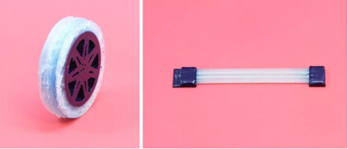 用新型3D打印機打印的一個輪子(左圖)和一根柔性導電帶。