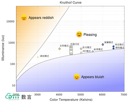色溫和照度的組合在一起對舒適度的影響就更復雜了,對此我們可以借助色溫與照度曲線(Kruithof’s curve)做大致評估。圖形的橫豎坐標分別是色溫和照度,中部是色溫和照度組合恰當為舒適區,而其他區域則被認為不舒適,其中左上區域偏紅(色溫低及照度高),右下區域則偏藍(色溫高及照度低)。因此,我們在設計教室照明模式時,應盡量落在中部舒適區內。