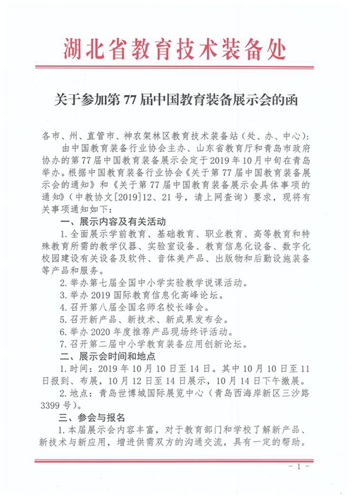湖北省教育技術(shù)裝備處關(guān)于參加第77屆中國教育裝備展示會的函