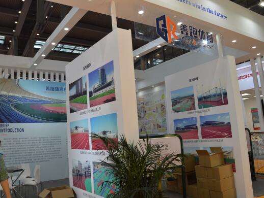 深圳善跑攜塑膠跑道材料、丙烯酸球場材料及硅PU球場材料、人造草坪等產(chǎn)品亮相。