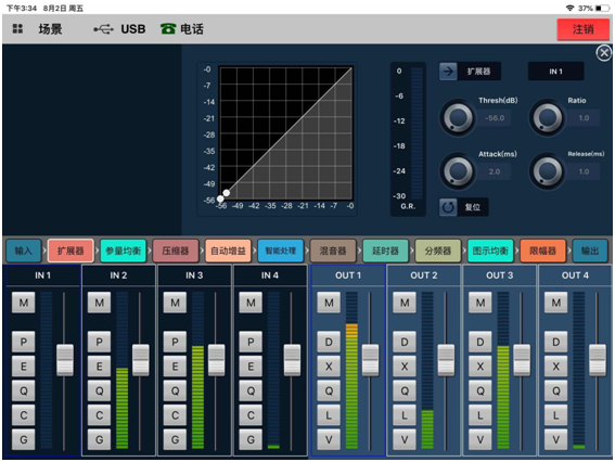 提供8路輸出,支持增益調節,48V幻想供電,內置前級放大、信號發生器、擴展器、壓縮器、5段參量均衡、31段圖示均衡、延時器、分頻器、限幅器等功能模塊。