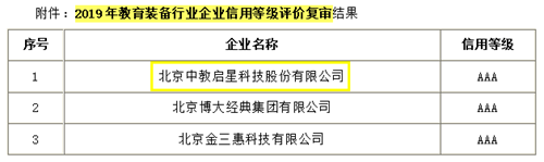 近期,2019年教育裝備行業企業信用等級評價復審結果出爐,中教啟星再次獲得AAA信用等級。