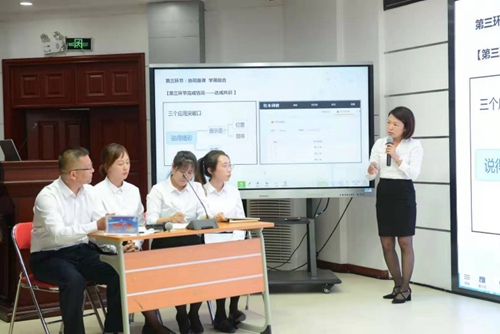 汽開區第十三小學語文團隊現場展示了基于信息技術支撐下的校本研修。研修采用了翻轉式、線上線下相融合的方式,圍繞如何引領孩子說得精彩的核心問題,破解了教育教學中的實際問題,同步提升了教師的學科專業素養和信息技術應用能力,提供了一個信息技術應用能力提升工程與校本研修相融合的現場案例。其中教師匯報討論應用的軟件為希沃白板5,利用了思維導圖以及板中板等功能實現歸納總結,并應用了希沃授課助手進行同屏互傳,遠程操控。