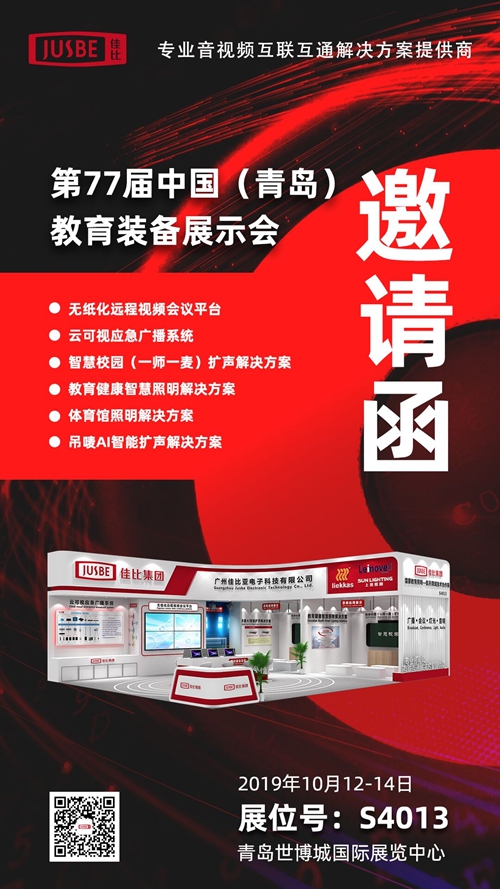 金秋十月,第77屆中國教育裝備展示會于2019年10月12日-14日在青島世博城國際展覽中心盛大舉行。佳比在 S4013 展位 誠邀全國各地教育專家、技術(shù)精英及廣大客戶朋友們蒞臨青島盛會!