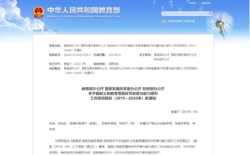 2019年8月21日,教育部、國家發(fā)改委、財(cái)政部三部聯(lián)合發(fā)布的《關(guān)于編制義務(wù)教育薄弱環(huán)節(jié)改善與能力提升工作項(xiàng)目規(guī)劃(2019-2020年)》的通知中,明確要重點(diǎn)做好三方面的工作:1.消除城鎮(zhèn)學(xué)校大班額;2.加強(qiáng)兩類學(xué)校建設(shè);3.推進(jìn)農(nóng)村學(xué)校教育信息化建設(shè)。