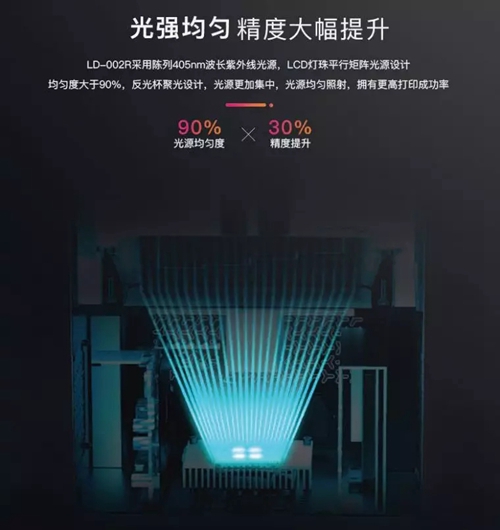 LD-002R采用陳列405nm波長(zhǎng)紫外線光源,LCD燈珠平行矩陣光源設(shè)計(jì),均勻度大于90%,反光杯聚光設(shè)計(jì),光源更加集中,光源均勻照射,有效避免光不均勻和光源衰竭導(dǎo)致打印失敗,大大提高打印成功率。