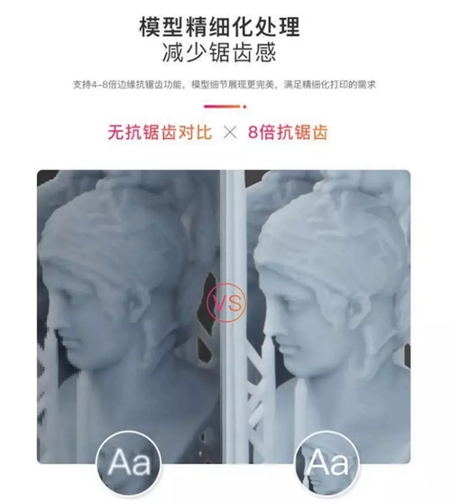 LD-002R系統(tǒng)支持4-8倍邊緣抗鋸齒功能,經(jīng)過專門的算法處理,可精準(zhǔn)地復(fù)原設(shè)計(jì)細(xì)節(jié),有效減少邊緣鋸齒現(xiàn)象,滿足精細(xì)化打印需求,使模型細(xì)節(jié)更光滑細(xì)膩,有效降低了后處理的難度和時(shí)間。