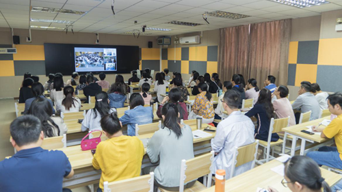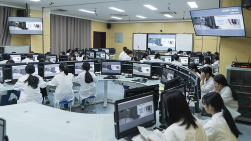 2019年10月31日,廣東省食品藥品職業(yè)技術(shù)學(xué)校的學(xué)生們像往常一樣進(jìn)行實(shí)訓(xùn)課程教學(xué)。但與以往普遍職校實(shí)訓(xùn)教學(xué)不一樣的是,老師和少部分學(xué)生在實(shí)訓(xùn)室上課,大部分學(xué)生在智慧課室上課,老師在實(shí)訓(xùn)室對(duì)設(shè)備結(jié)構(gòu)和操作進(jìn)行講解,學(xué)生在互動(dòng)智慧課室通過(guò)座位前的屏幕觀看老師上課。聽(tīng)課的老師們則在另外的觀課室對(duì)課程進(jìn)行全程的觀摩。