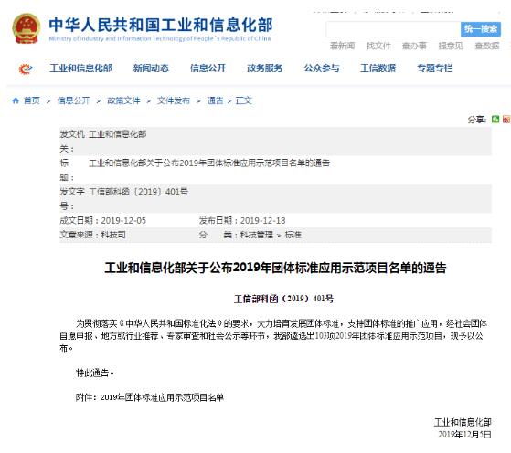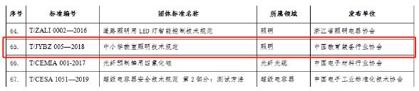 12月18日,中華人民共和國工業(yè)和信息化部發(fā)布《關(guān)于公布2019年團(tuán)體標(biāo)準(zhǔn)應(yīng)用示范項(xiàng)目名單的通告》(工信部科函〔2019〕401號(hào)),遴選出103項(xiàng)2019年團(tuán)體標(biāo)準(zhǔn)應(yīng)用示范項(xiàng)目。由中國教育裝備行業(yè)協(xié)會(huì)發(fā)布并歸口的團(tuán)體標(biāo)準(zhǔn)T/JYBZ 005—2018《中小學(xué)教室照明技術(shù)規(guī)范》成功入選工信部2019年團(tuán)體標(biāo)準(zhǔn)應(yīng)用示范項(xiàng)目,見圖1。