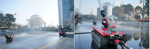 此外,大華智能消防機(jī)器人還在現(xiàn)場(chǎng)進(jìn)行了滅火演練作業(yè)。在彩虹的映襯下,消防機(jī)器人成功撲滅了演練時(shí)點(diǎn)燃的火焰。