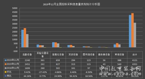2019年12月份,根據(jù)中國(guó)教育裝備網(wǎng)對(duì)國(guó)內(nèi)教育裝備招中標(biāo)采購(gòu)信息量的數(shù)據(jù)統(tǒng)計(jì)顯示,該月招標(biāo)采購(gòu)信息量為4351條,較上月有小幅增長(zhǎng),較去年同期有明顯增長(zhǎng)。
