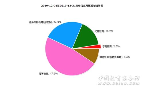 12月份招標(biāo)采購(gòu)信息所屬領(lǐng)域統(tǒng)計(jì)情況如圖6所示:學(xué)前教育占比為2.5%;義務(wù)教育占比為16.2%;高中階段教育(含職教)占比為24.3%;高等教育占比為47.6%;其他教育(含特殊教育)占比為9.4%。