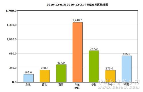 從12月中標(biāo)信息地區(qū)統(tǒng)計(jì)圖(如圖8所示)和全國(guó)中標(biāo)信息地區(qū)占比圖(如圖9所示)來(lái)看:華東地區(qū)中標(biāo)信息量為1448條,占比36%;華北地區(qū)中標(biāo)信息量為747條,占比19%;華南地區(qū)中標(biāo)信息量為625條,占比16%;西南地區(qū)招中標(biāo)信息量為417條,占比10%;西北地區(qū)中標(biāo)信息量為288條,占比7%;華中地區(qū)中標(biāo)信息量為275條,占比7%;東北地區(qū)中標(biāo)信息量為185條,占比5%。