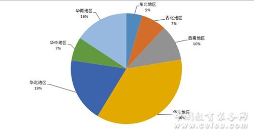 從12月招標(biāo)采購(gòu)信息地區(qū)統(tǒng)計(jì)圖(如圖3所示)和全國(guó)招標(biāo)采購(gòu)信息量地區(qū)占比圖(如圖4所示)可以看出:華東地區(qū)招標(biāo)采購(gòu)信息量為1408條,占比32%;華北地區(qū)招標(biāo)采購(gòu)信息量為823條,占比19%;華南地區(qū)招標(biāo)信息采購(gòu)量為624條,占比14%;西北地區(qū)招標(biāo)采購(gòu)信息量為463條,占比11%;西南地區(qū)招標(biāo)采購(gòu)信息量為442條,占比10%;華中地區(qū)招標(biāo)采購(gòu)信息量為369條,占比8%;東北地區(qū)招標(biāo)采購(gòu)信息量為244條,占比6%。