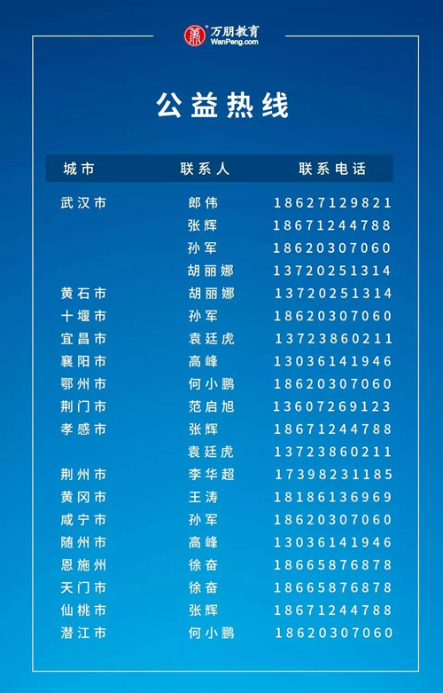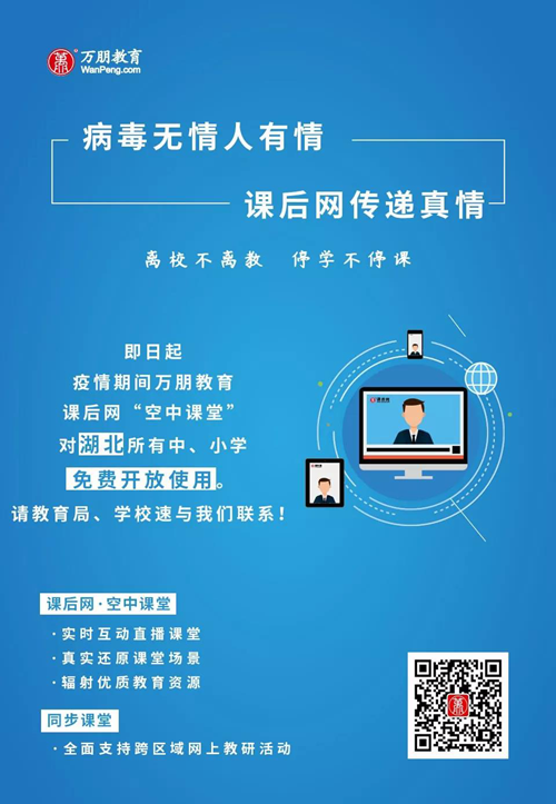 即日起,面向湖北省各中小學,萬朋教育課后網(wǎng)空中課堂疫情期間一律免費使用!力保疫情期湖北地區(qū)中、小學教學進度不受影響,教研不間斷!
