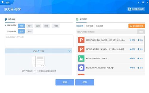 所有的云端資源,老師均可以選擇直接下載為我所用,也可以自己在線制作,或者上傳個(gè)性化導(dǎo)學(xué)課件,自由選擇是否與與校園內(nèi)、省市區(qū)域內(nèi)或者全國(guó)區(qū)域內(nèi)的老師們共享。