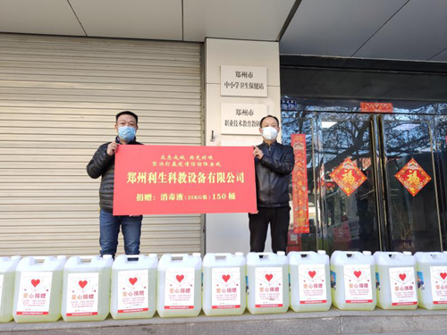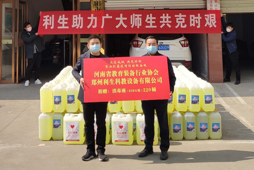 協會副會長單位鄭州利生科教設備有限公司在做好企業自身疫情防控的同時,積極與慈善部門聯系,第一時間向慈善部門捐贈現金15萬元,并多方籌措了數十噸價值六十余萬元的84消毒液、紅外測溫計,酒精等物資,準備專車專人,疫情期間行程幾千公里,捐贈給鄭州市教育局、洛陽市教育局、開封市教育局、鶴壁市教育局、三門峽市教育局、金水區教育局、新密市教育體育局、新密市人力資源和社會保障局、洛陽市老城區教育體育局、洛陽市洛龍區教育體育局、許昌市魏都區教育體育局、襄縣教育局、禹州教育局、鄭州市二七區教育局、湯陰縣教育局、安陽市教育局、漯河市源匯區教育局、南陽市教育局等單位。目前,還有多個地市的教育系統正在積極對接中。