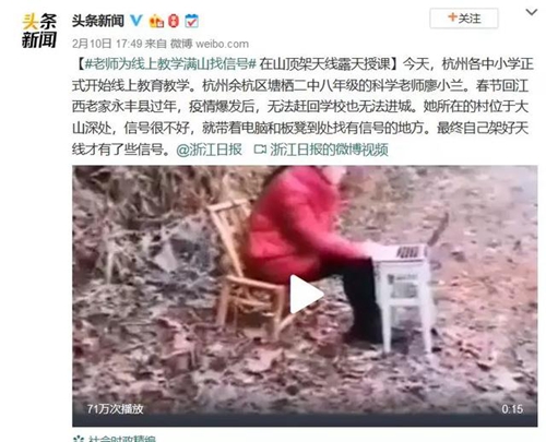 直播設備解決了,網絡又成了問題。在偏遠地區(qū)網絡信號不好,老師每天直播上課的時候,只能帶著電腦和板凳到處找信號,最終自己架好天線才有了些信號。