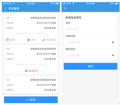 研學(xué)管理模塊主要管理個人研學(xué)計劃,通過此功能模塊教師可以記錄和發(fā)布教學(xué)個人計劃、集體研修、聽評課記錄、參培記錄、課列研磨等信息。參加教研活動的老師,可以對主持人或上課人進(jìn)行評價,評價時可以輸入文字內(nèi)容也可以拍照。評價過后主持人或上課人可以查看所有關(guān)于活動的評價內(nèi)容。