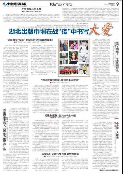 ——風雨同舟,典型引路。愛立方黨員除了躬身參與抗疫這場人民戰爭,還主動繳納“特殊黨費”,助力抗擊疫情。三八婦女節前夕,讓疫情變“疫苗”的郁丹和從線下到線上的金錦秀,作為長江傳媒推出的8位巾幗英雄,受到《中國出版傳媒商報》的專題報道;肖艷霞、程曉毅、付歡、黃康、周玥、陳姣、劉勝男、葉璞薇、徐祎祎、侯婕、李曉睿、周柏姿、張國等員工為“致敬逆行者”創作的巾幗主題作品贏得廣泛好評。三八婦女節當天,以《疫情之下,90后幼教工作者的責任與擔當》為主題的愛立方大講堂暨三八婦女節公益直播課活動順利開展,為廣大幼教工作者進行勵志分享和心理輔導,贏得一片贊譽。